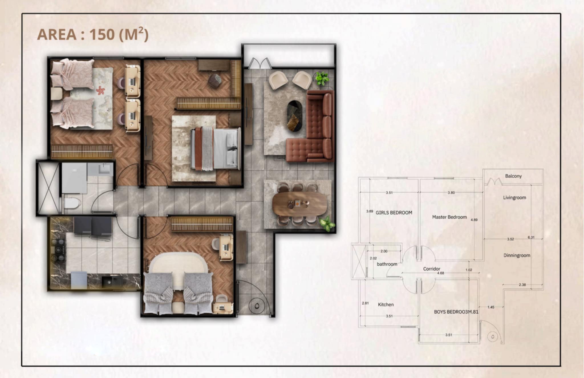 الشقة تتكون من ريسيبشن قطعتين + 3 غرف + 2 حمام + مطبخ
